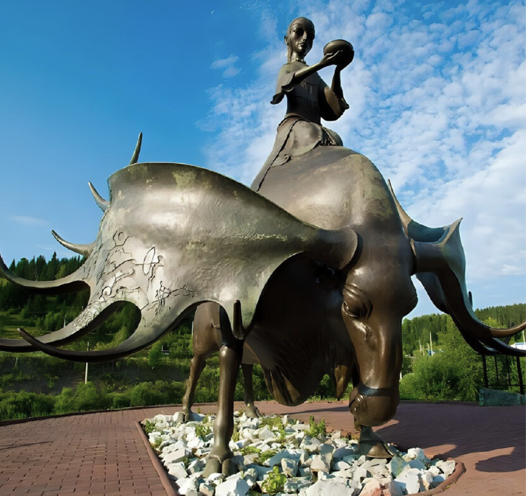 На спине животного сидит девушка с чашей — аллегория гостеприимства, приглашения и связи между современной Золотой Шорией и её далёким прошлым. В чаше горит «вечный огонь», питаемый природным газом, и его отблески мерцают на позолоченных орнаментах её одежды, подчёркивая сакральный характер всей композиции.